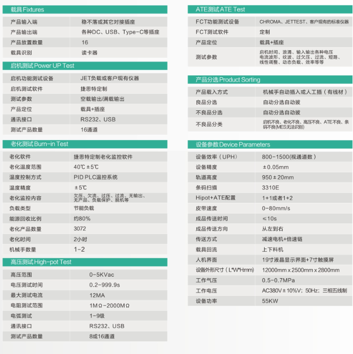 3:具备条码扫描、启机蓝颜 、老化蓝颜 、高压蓝颜 、ATE蓝颜 、自动产品分类,自动下料等功能。